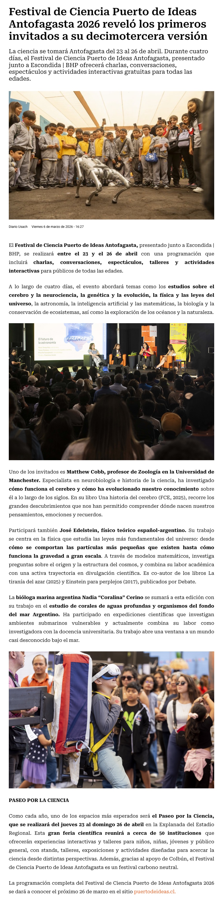 Festival de Ciencia Puerto de Ideas Antofagasta 2026 confirma primeros invitados - (tvn.cl)