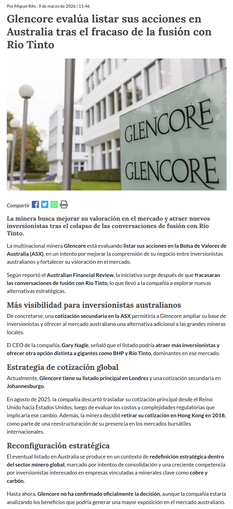 Glencore analiza listar acciones en Australia para reforzar su valoración tras fallida fusión con Rio Tinto - (redimin)
