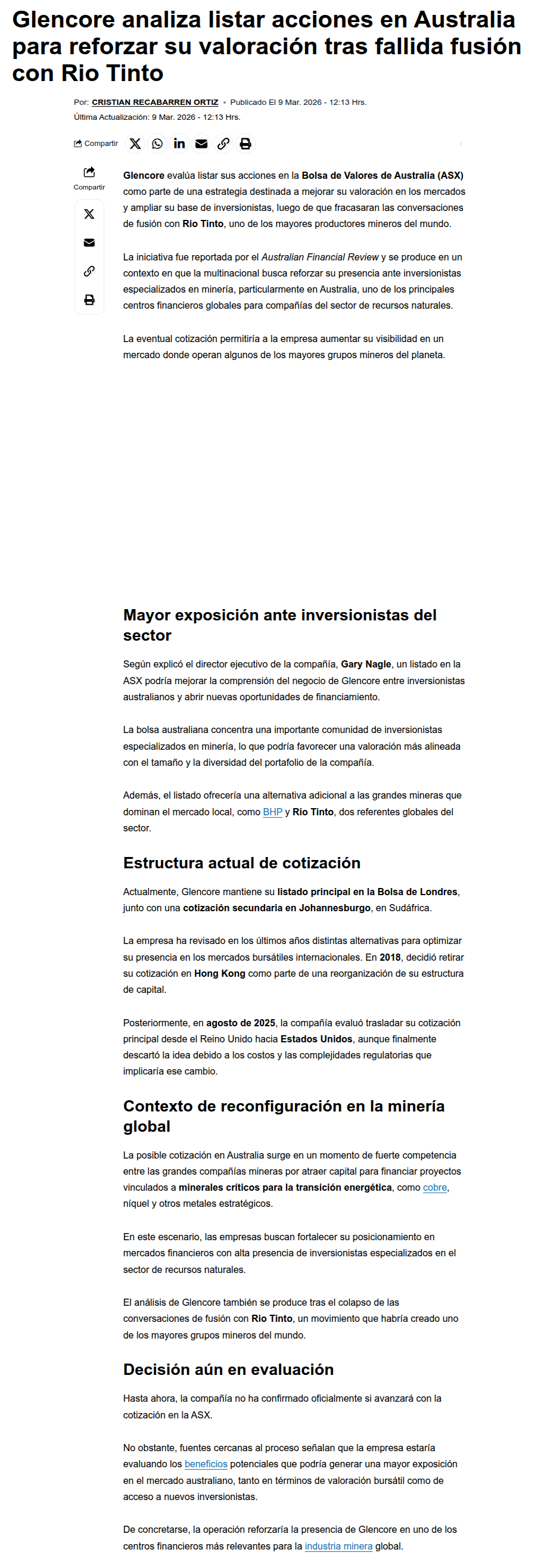 Glencore evalúa listar sus acciones en Australia tras el fracaso de la fusión con Rio Tinto - (reporteminero)
