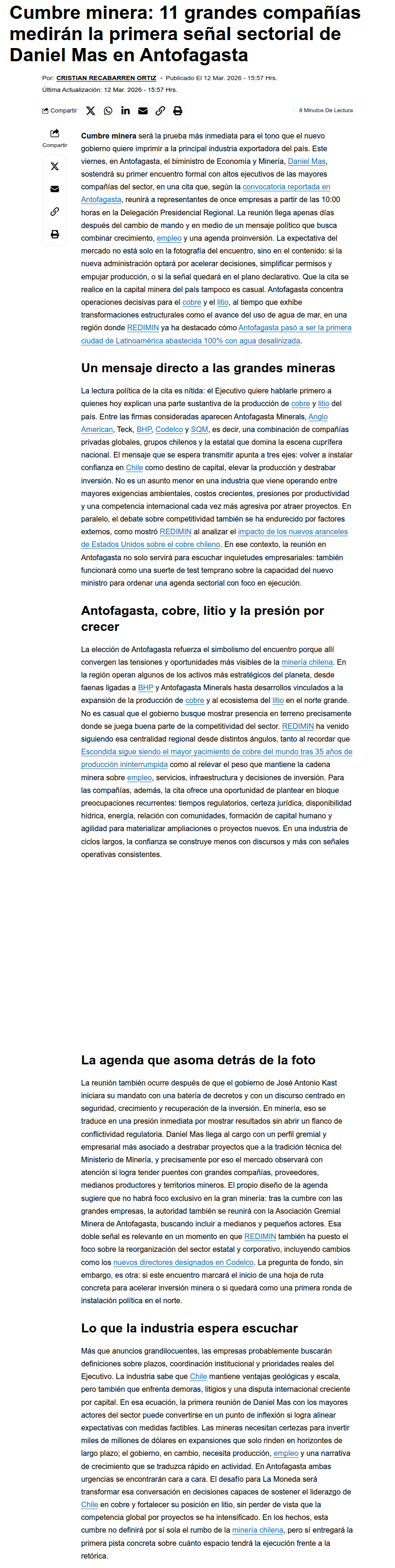 Cumbre minera reunirá al ministro Daniel Mas con las grandes empresas del sector en Antofagasta - (La Tercera Online)