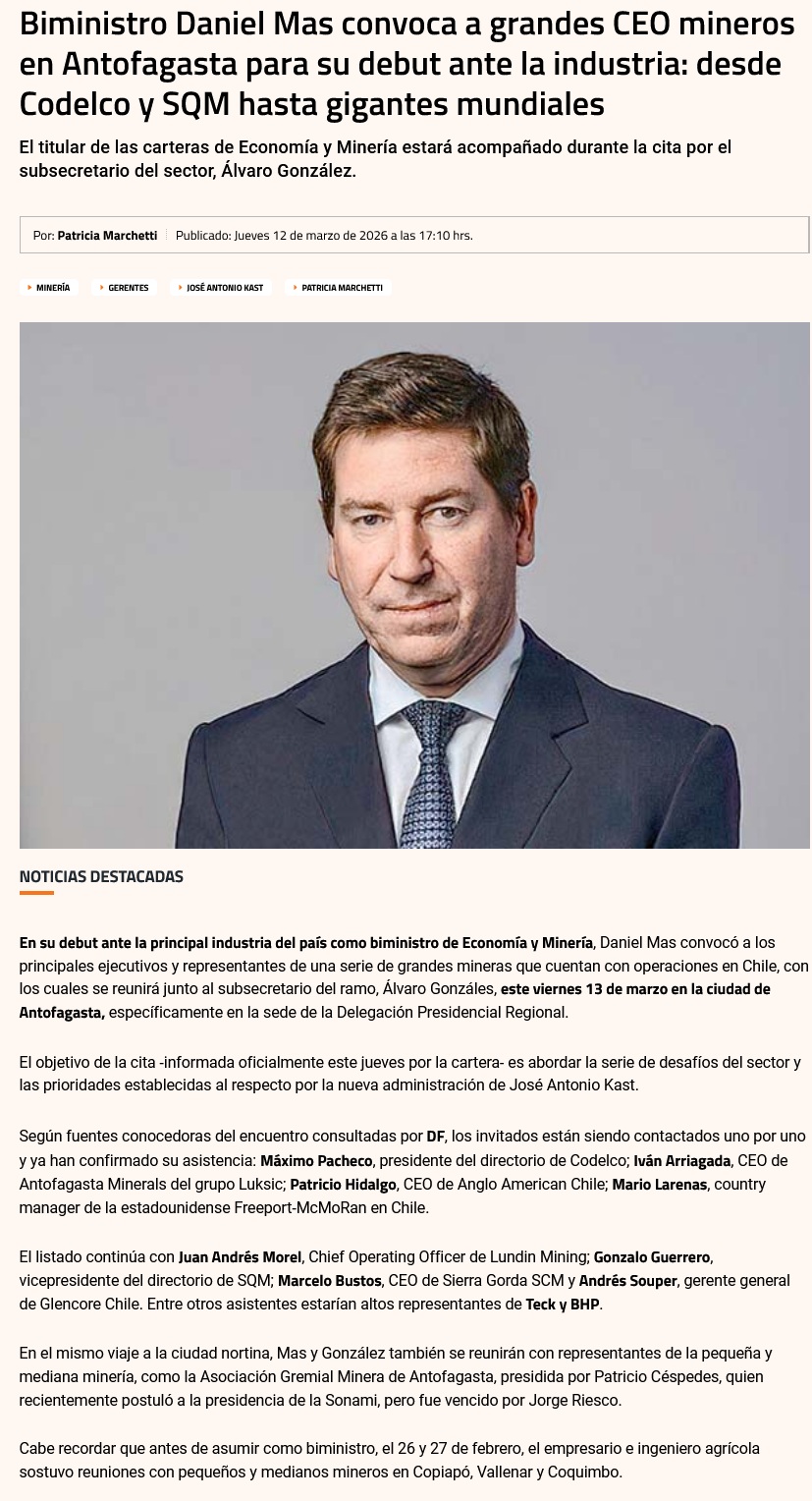 Cumbre minera reunirá al ministro Daniel Mas con las grandes empresas del sector en Antofagasta - (La Tercera Online)