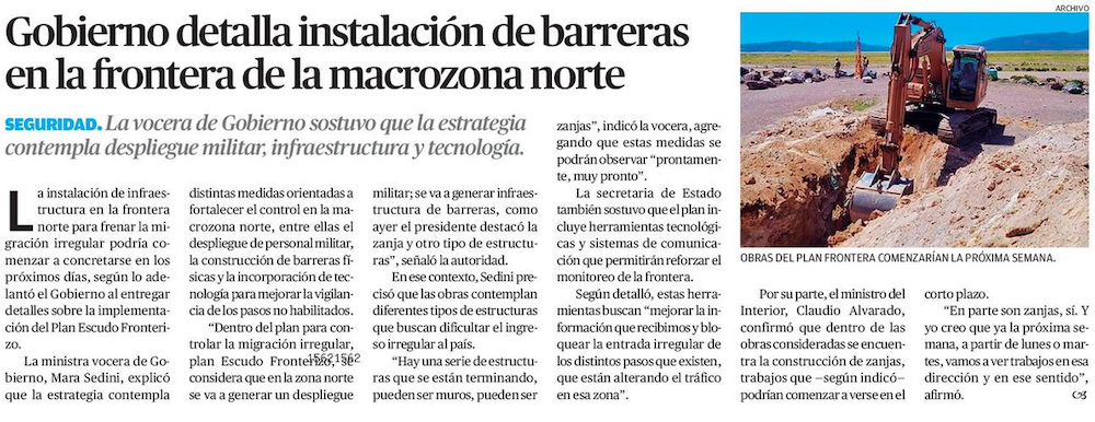 Kast pone en marcha “Plan Escudo Fronterizo” en Chacalluta con inicio de construcción de zanjas - (La Tercera)