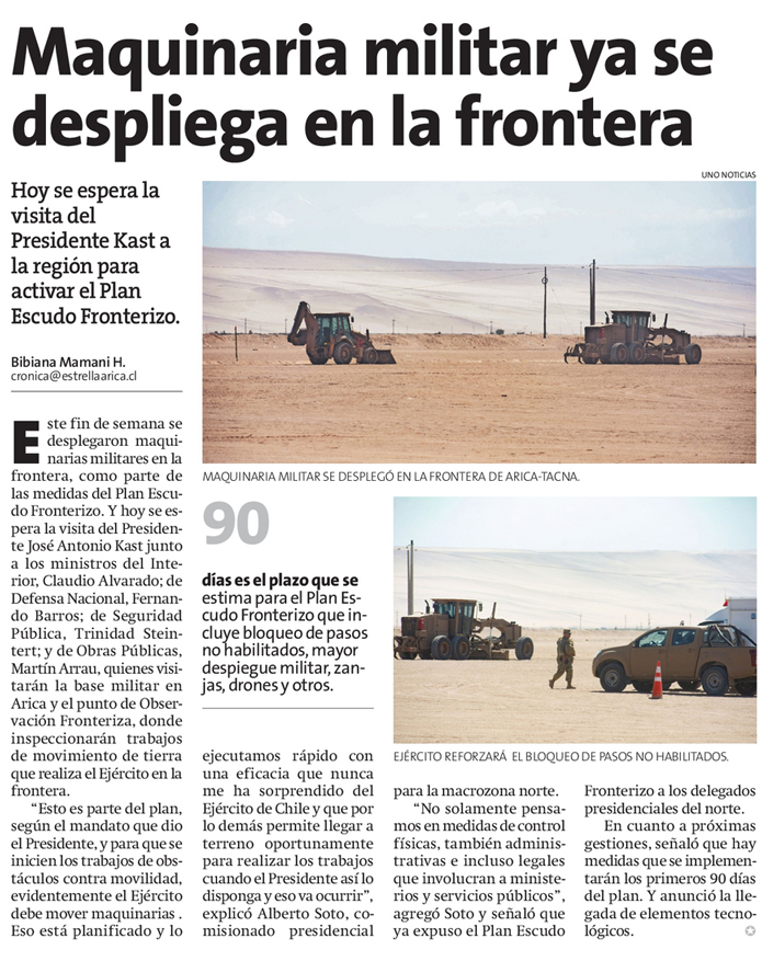 Gobierno inicia los movimientos de máquinas del Ejército a las fronteras - (Estrella de Iquique)