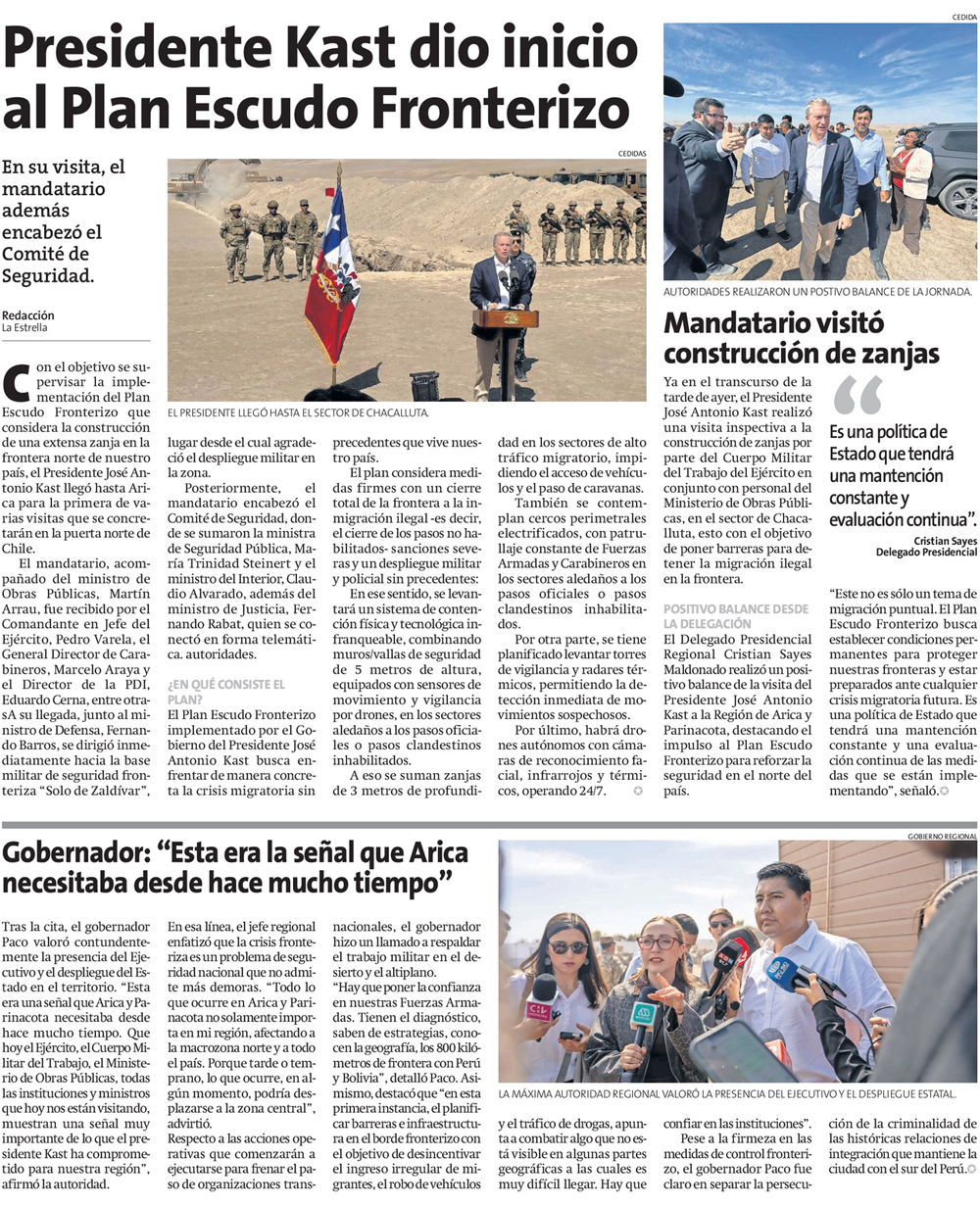 Kast visitó Arica para verificar en terreno construcción de la zanja: ya van 3 kilómetros - (El Mercurio de Santiago)