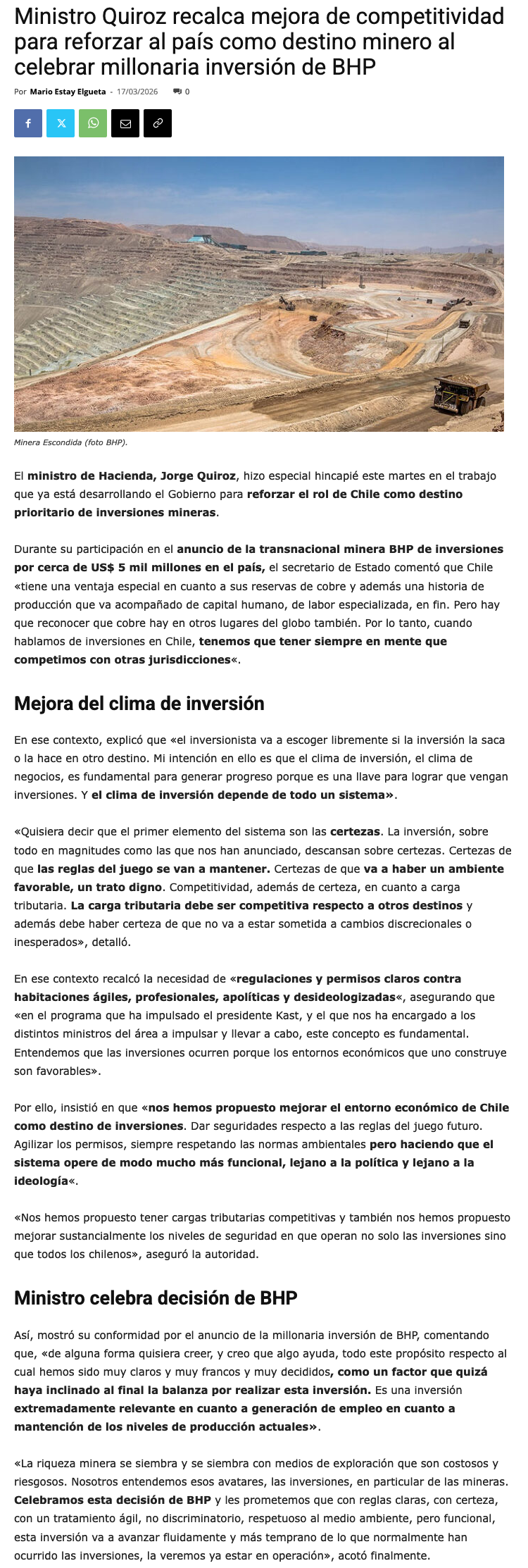 Ministro de Hacienda, Jorge Quiroz, destaca inversión de BHP en Escondida por más de US$5.000 millones en Antofagasta - (canalsurpatagonia.cl)