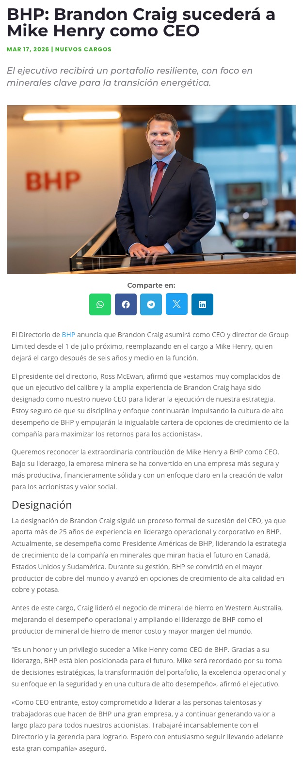 Brandon Craig sucederá Mike Henry como CEO de BHP - (revistacrisol.cl)