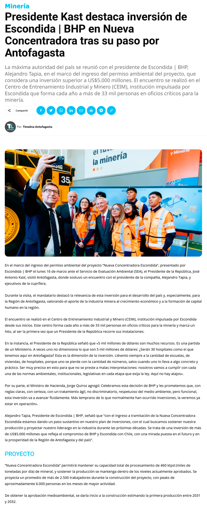 Presidente Kast destaca inversión de Escondida | BHP en Nueva Concentradora tras su paso por Antofagasta - (antofagasta.tv)