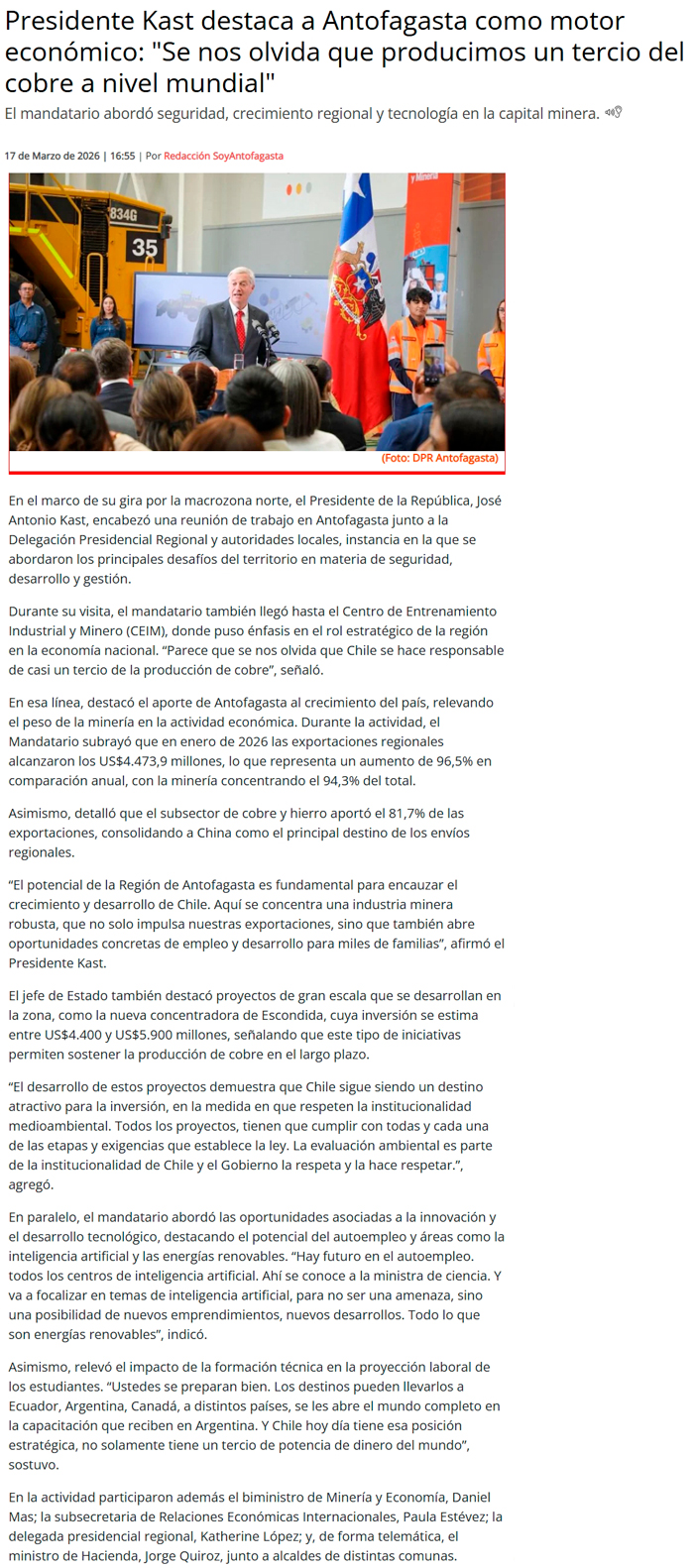 Presidente Kast destaca inversión de Escondida | BHP en Nueva Concentradora tras su paso por Antofagasta - (antofagasta.tv)
