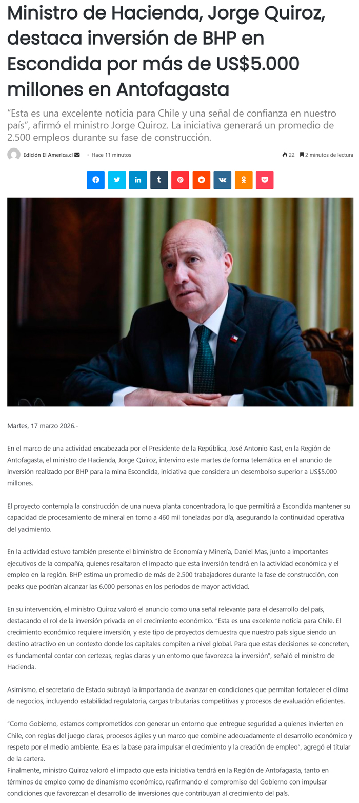 Ministro de Hacienda, Jorge Quiroz, destaca inversión de BHP en Escondida por más de US$5.000 millones en Antofagasta - (canalsurpatagonia.cl)