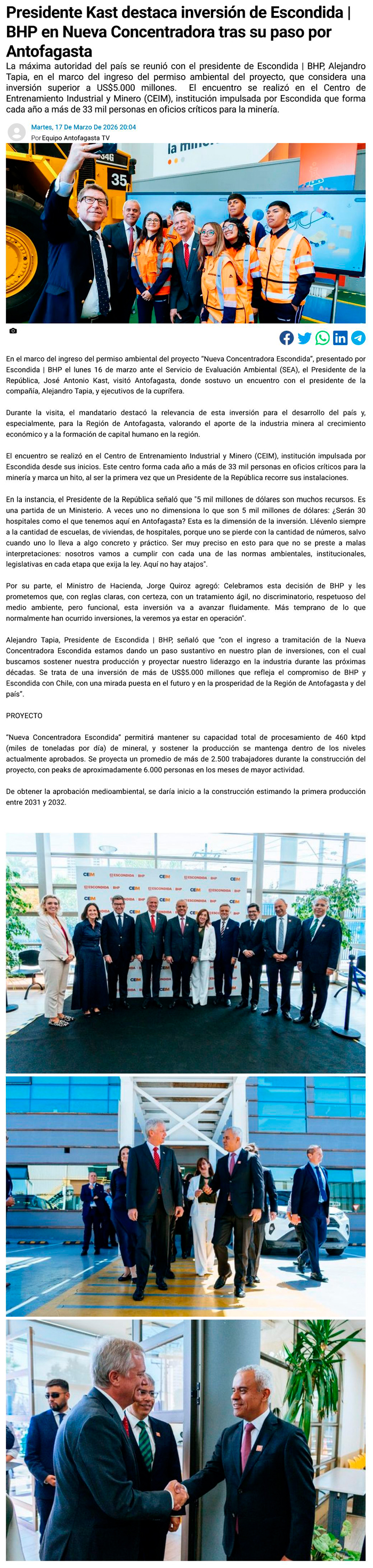 Tras su paso por Antofagasta: Presidente Kast destaca inversión de Escondida|BHP en nueva concentradora - (resonanciadiario.cl)