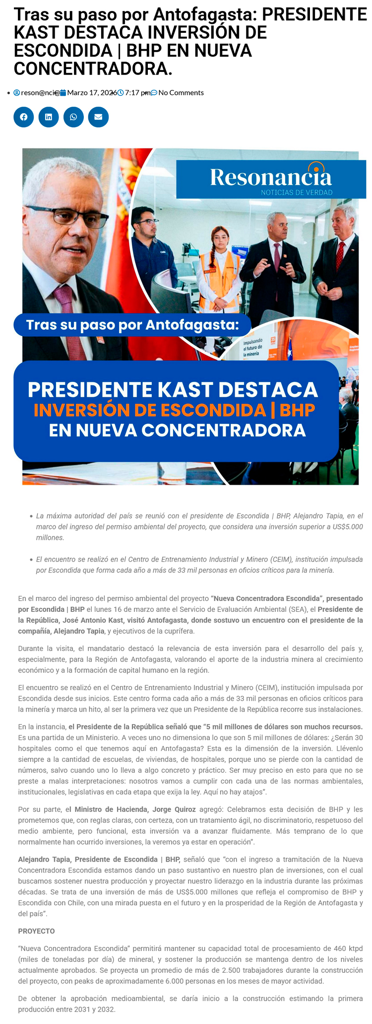 Presidente Kast destaca inversión de Escondida | BHP en Nueva Concentradora tras su paso por Antofagasta - (antofagasta.tv)