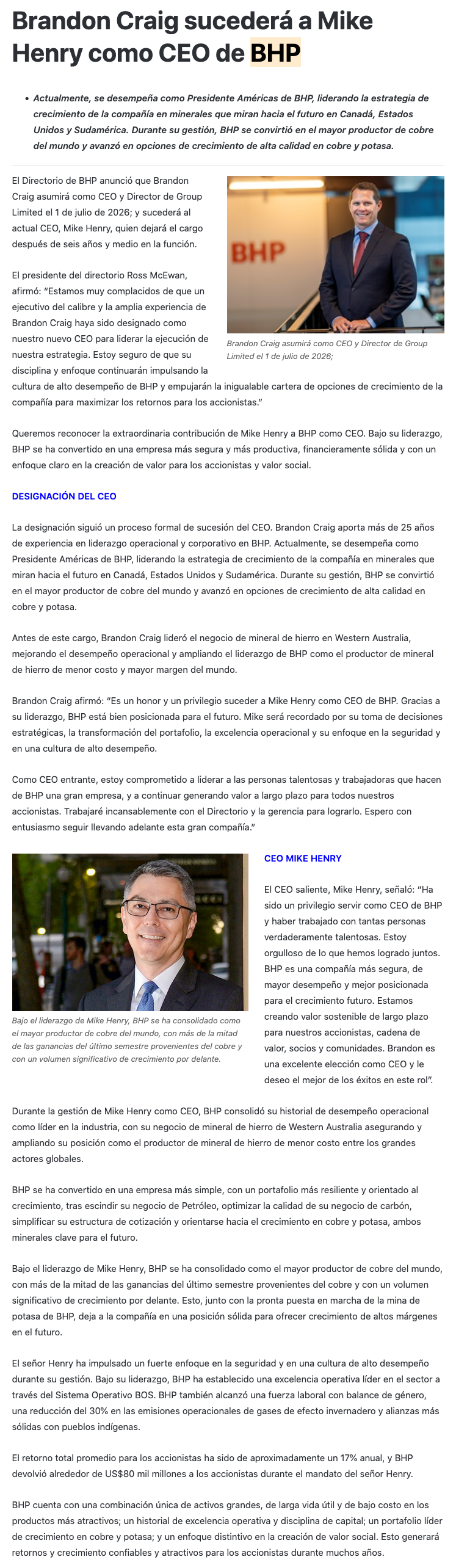 Directivos: Brandon Craig sucederá a Mike Henry como CEO de BHP desde 1ro Jul 2026 - (Valor Futuro)