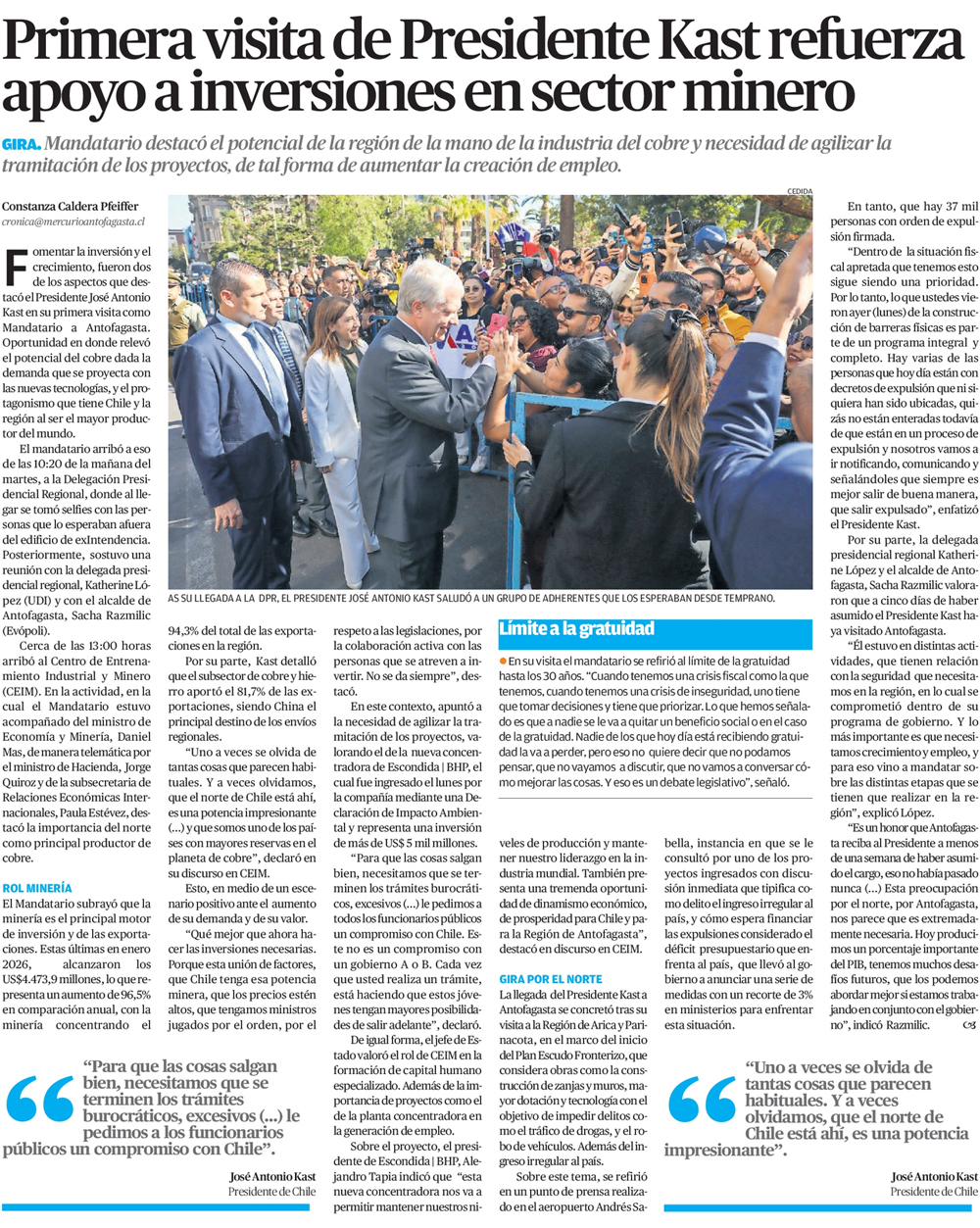 Presidente Kast visitó la región para fomentar la inversión y crecimiento - (El Mercurio de Calama)