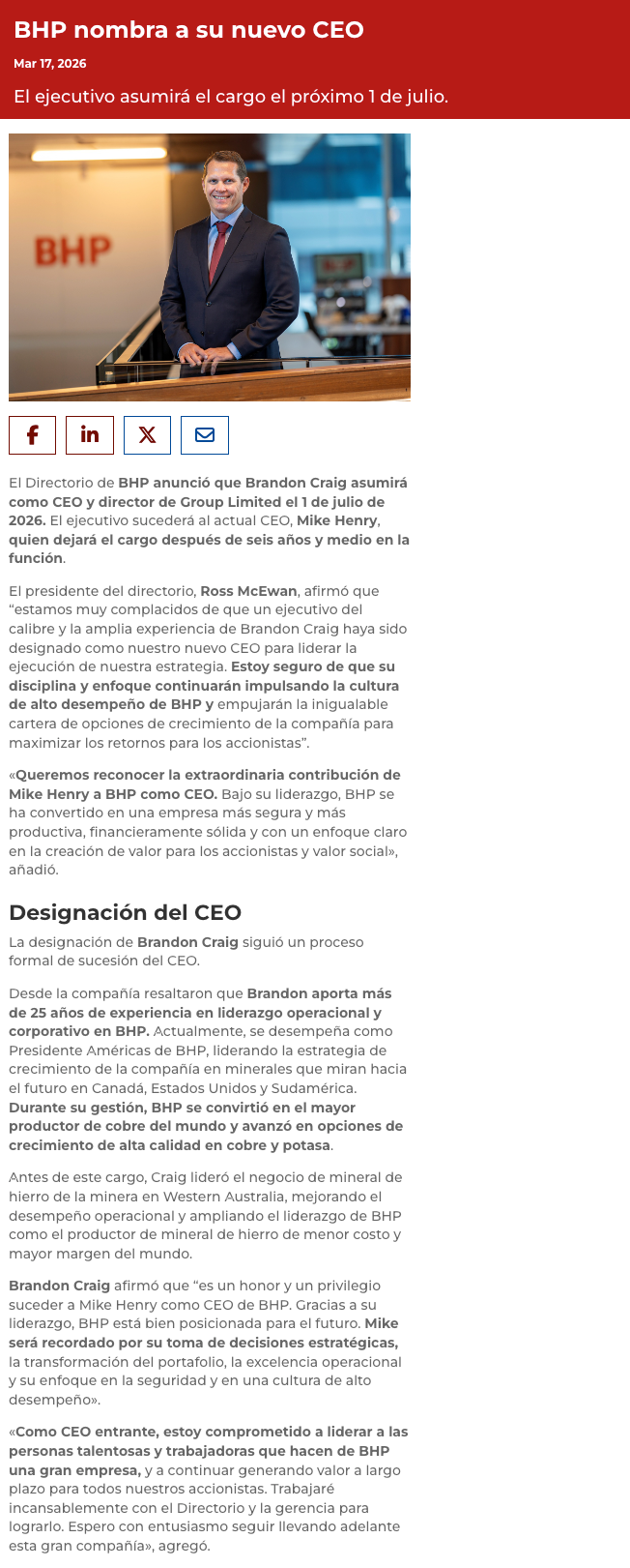 Brandon Craig sucederá Mike Henry como CEO de BHP - (revistacrisol.cl)
