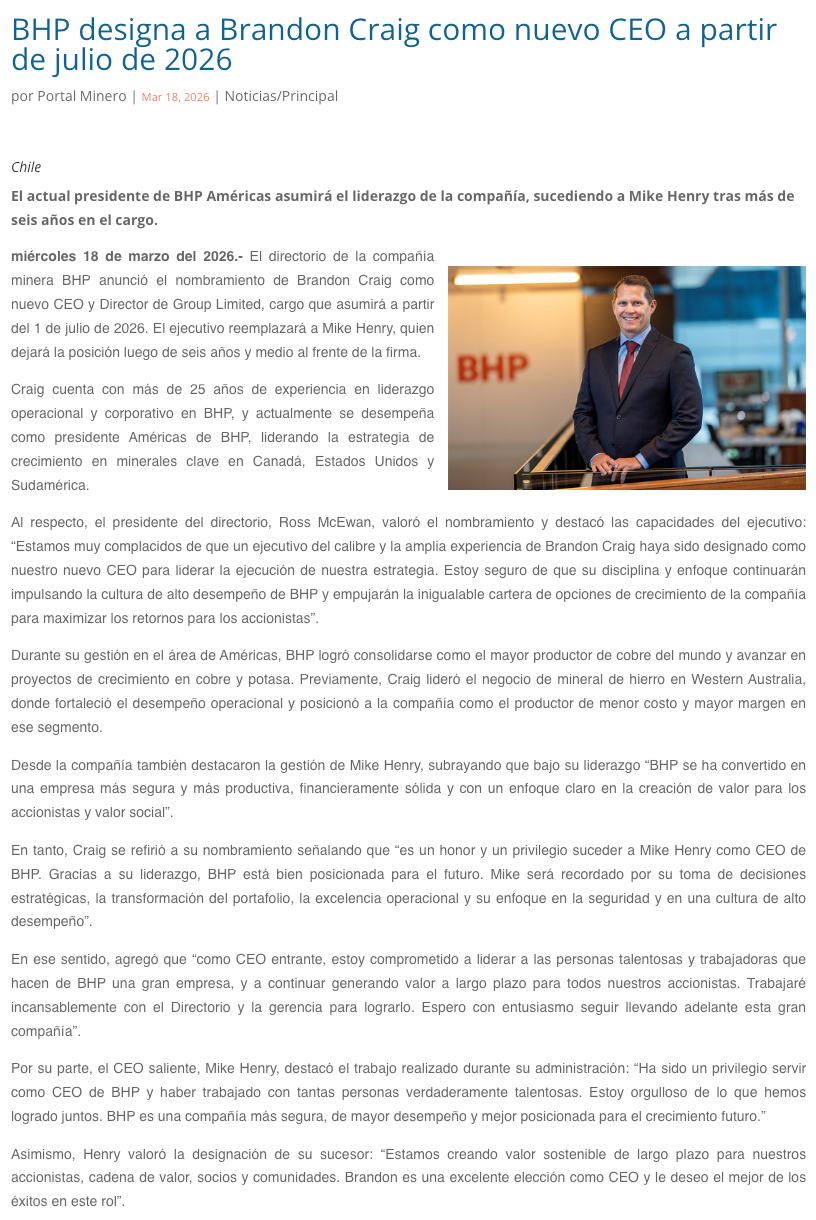 BHP anuncia nuevo CEO: Brandon Craig sucederá a Mike Henry que dejará el cargo tras más de 6 años - (Pulso Online)