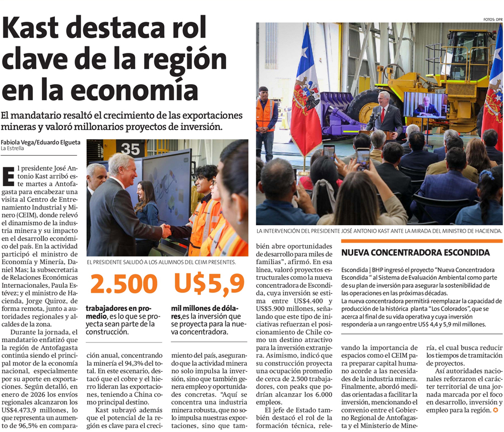 Primera visita de Presidente Kast refuerza apoyo a inversiones en sector minero - (El Mercurio de Antofagasta)