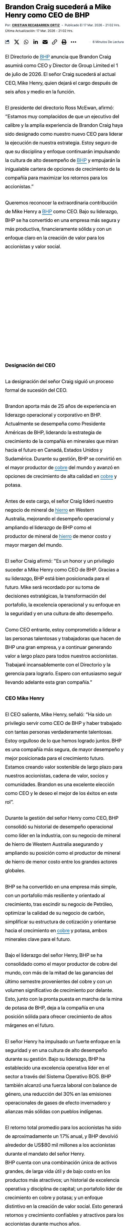 BHP anuncia nuevo CEO: Brandon Craig sucederá a Mike Henry que dejará el cargo tras más de 6 años - (Pulso Online)