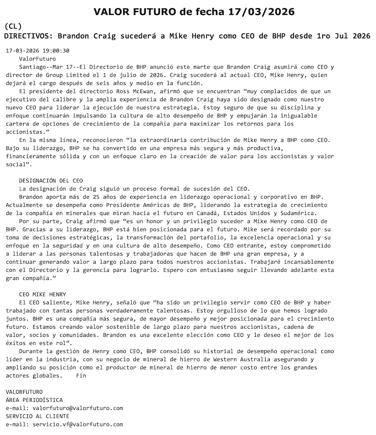 BHP anuncia nuevo CEO: Brandon Craig sucederá a Mike Henry que dejará el cargo tras más de 6 años - (Pulso Online)