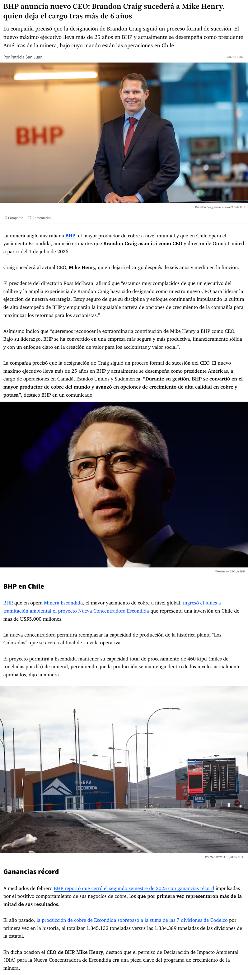 Directivos: Brandon Craig sucederá a Mike Henry como CEO de BHP desde 1ro Jul 2026 - (Valor Futuro)