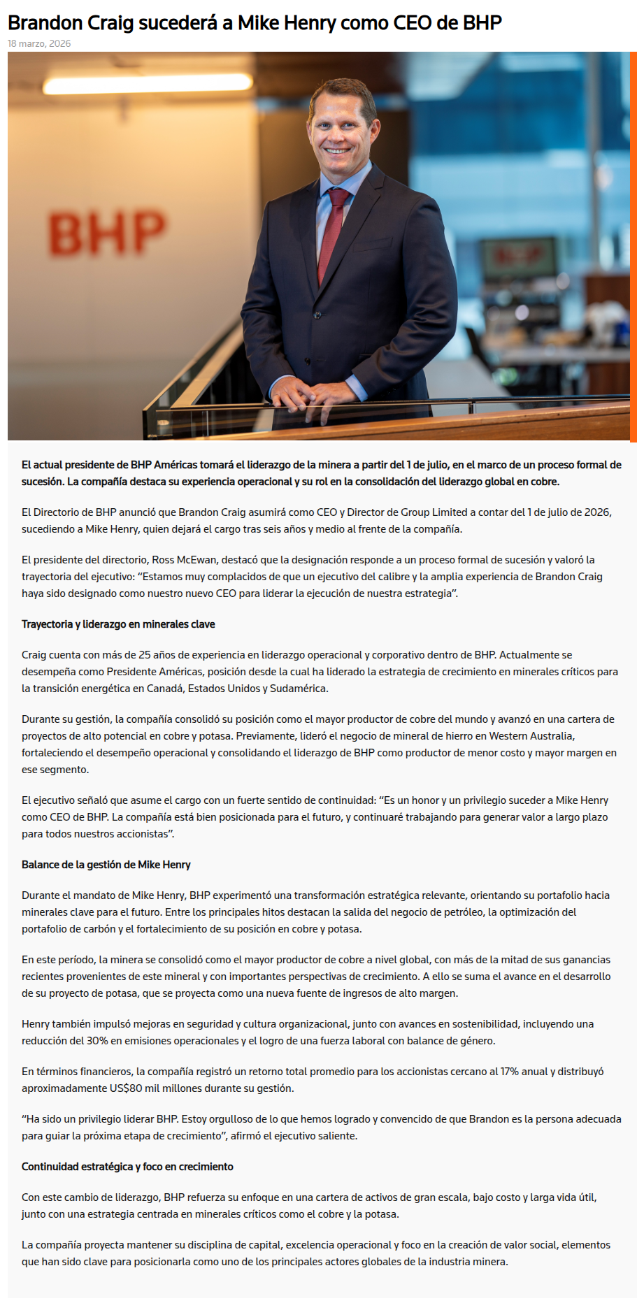 Exchange release Brandon Craig sucederá a Mike Henry como CEO de BHP - (mvcomunicaciones.cl)