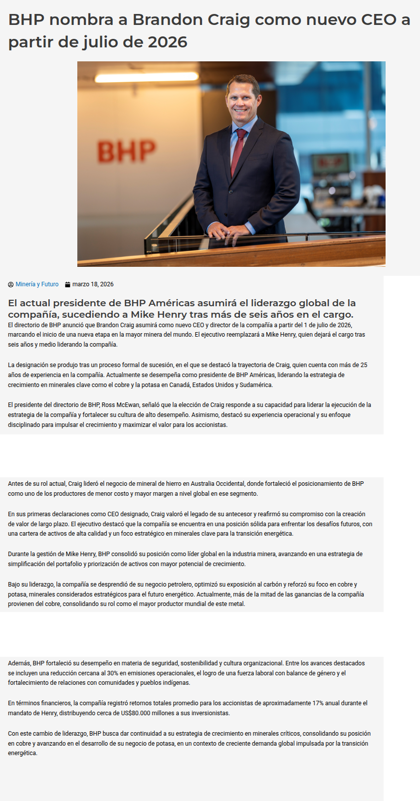 Exchange release Brandon Craig sucederá a Mike Henry como CEO de BHP - (mvcomunicaciones.cl)