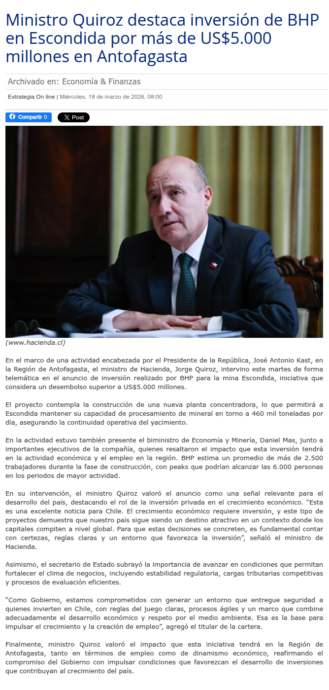 Ministro de Hacienda, Jorge Quiroz, destaca inversión de BHP en Escondida por más de US$5.000 millones en Antofagasta - (canalsurpatagonia.cl)
