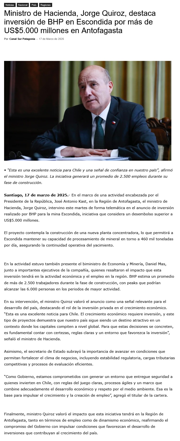 Ministro de Hacienda, Jorge Quiroz, destaca inversión de BHP en Escondida por más de US$5.000 millones en Antofagasta - (atacamanoticias)
