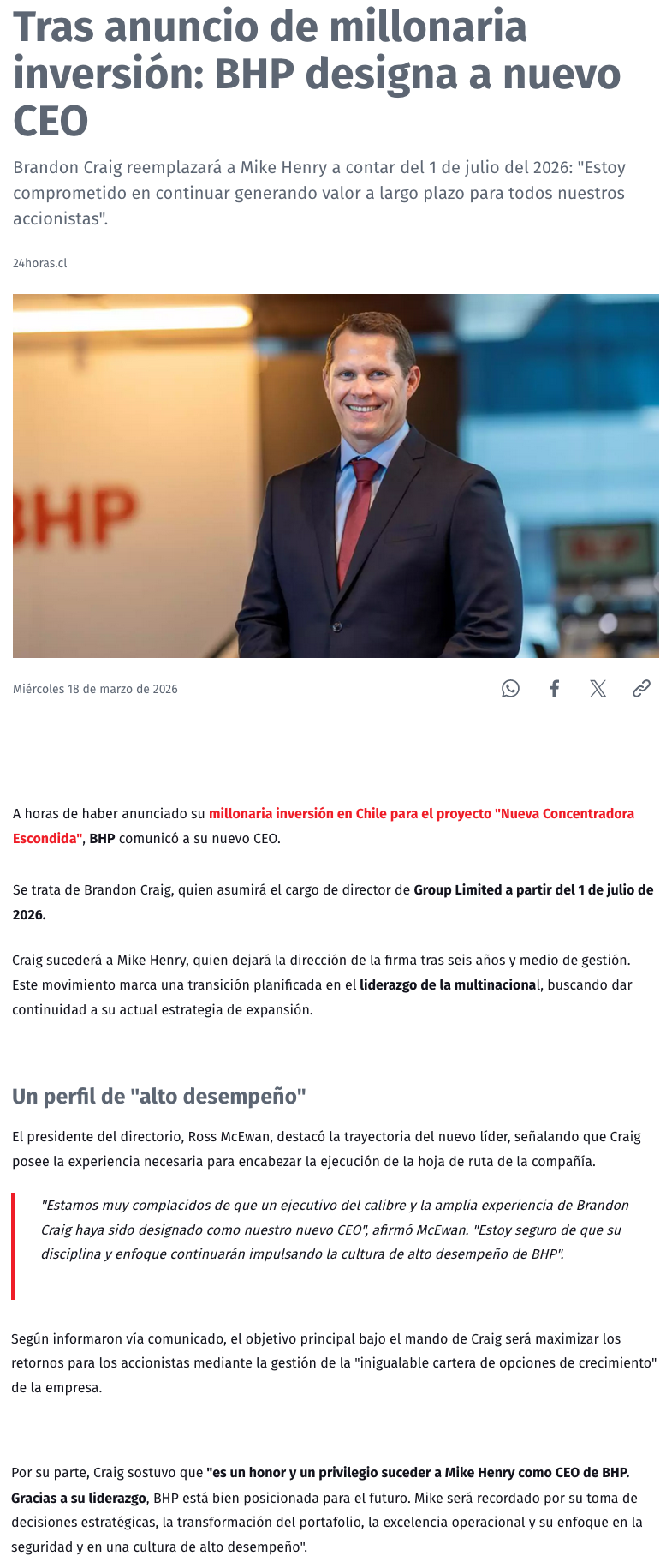 BHP anuncia a Brandon Craig como nuevo CEO de la minera - (El Mercurio de Calama)