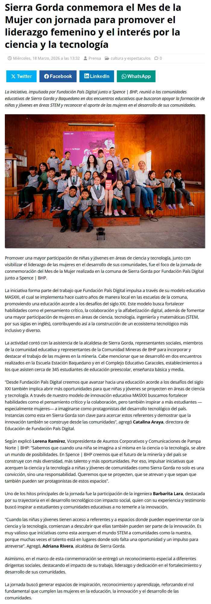 Sierra Gorda conmemora el Mes de la Mujer con jornada para promover el liderazgo femenino y el interés por la ciencia y la tecnología - (presslatam.cl)