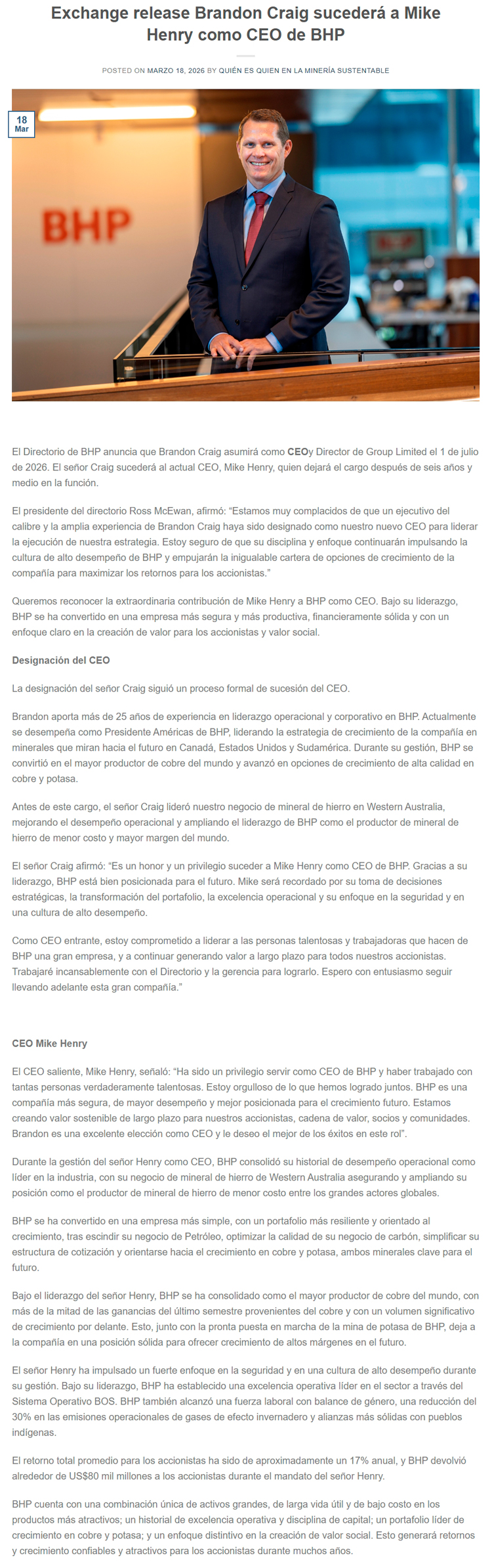 BHP anuncia a Brandon Craig como nuevo CEO de la minera - (El Mercurio de Calama)