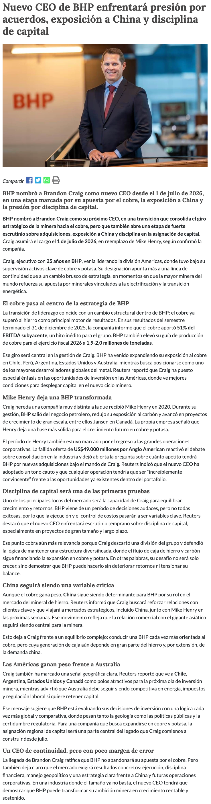 BHP nombra a Brandon Craig como nuevo CEO a partir de julio de 2026 - (nuevaminería online)