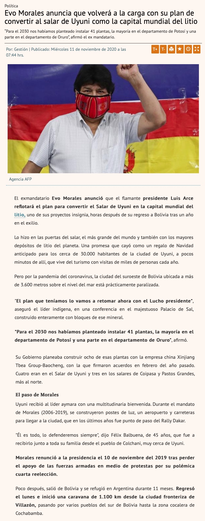 Evo Morales anuncia que Arce reactivará su plan de convertir Uyuni en la capital mundial del litio - (biobiochile online)