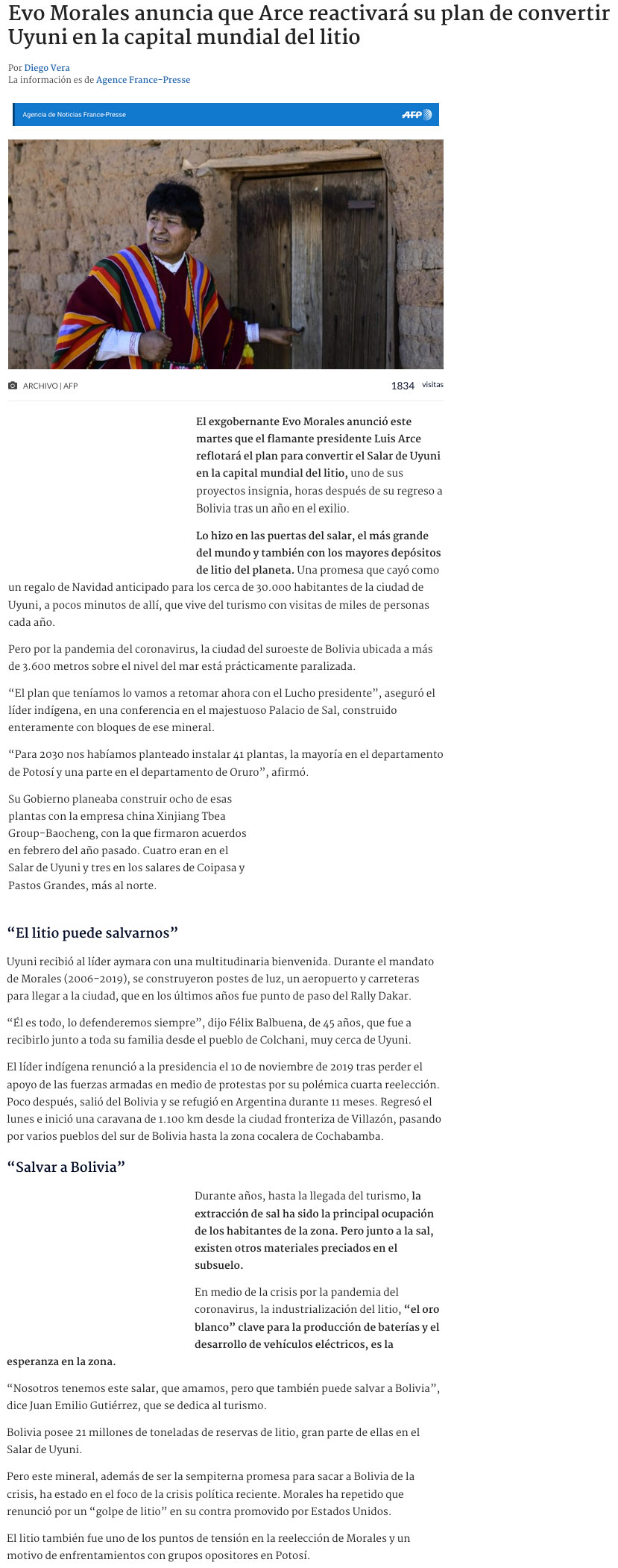 Evo Morales anuncia que volverá a la carga con su plan de convertir al salar de Uyuni como la capital mundial del litio - (DF Online)