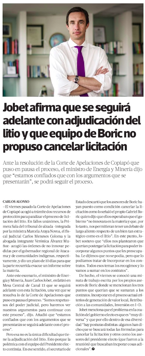 Jobet dice que asesores de Boric no pidieron cancelar licitación del litio, solo postergarla - (Diario Financiero)