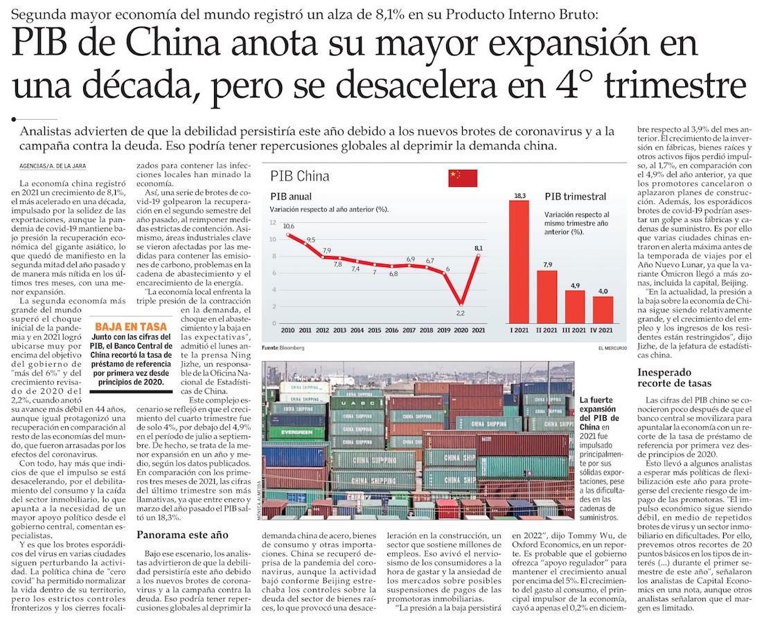 Pese a la desaceleración en último trimestre, China creció 8,1% en 2021 - (La Segunda)