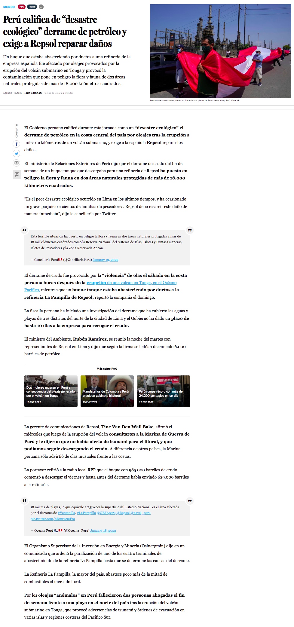 Perú califica de “desastre ecológico” derrame de petróleo - (El Mercurio de Santiago)