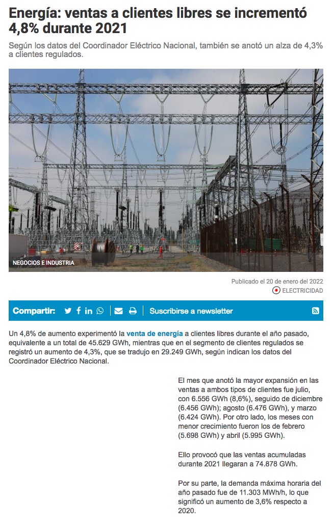 Venta de energía a clientes libre se incrementó 4,8% durante 2021 - (mch.cl)