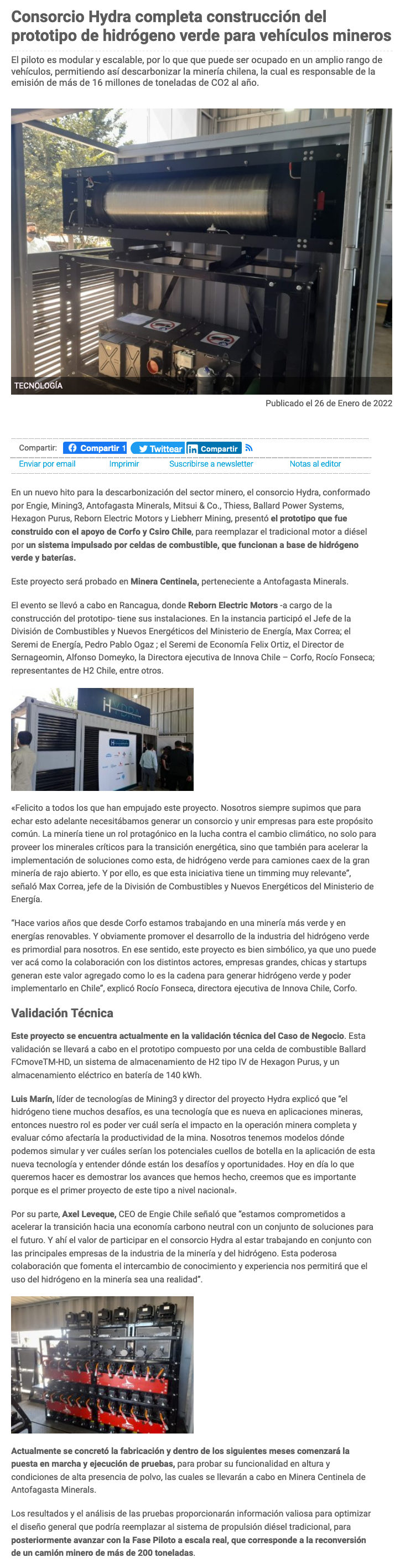 Consorcio Hydra completa construcción del prototipo de hidrógeno verde para vehículos mineros - (Estrategia)