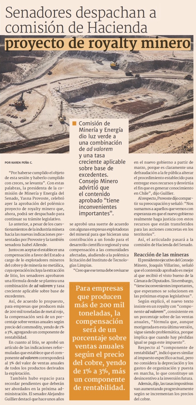Comisión del Senado da luz verde a proyecto de royalty minero - (El Mercurio de Santiago)