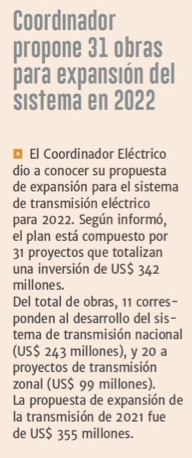 Coordinador Eléctrico propone 31 proyectos por US$ 342 millones para expansión del sistema de transmisión de 2022 - (DF Online)
