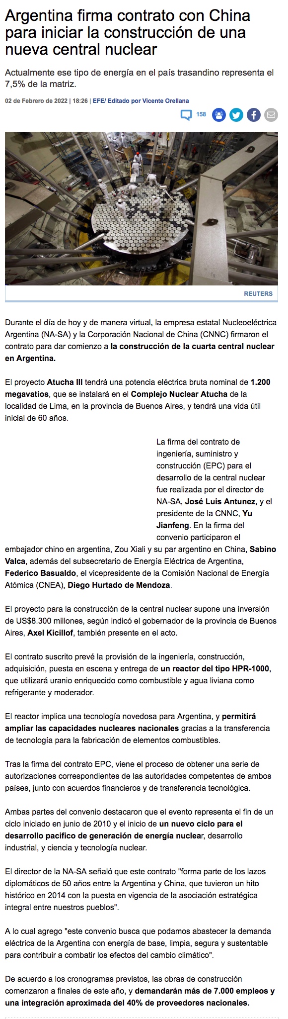 Argentina firma contrato con China para la construcción de central nuclear - (El Mercurio de Santiago)