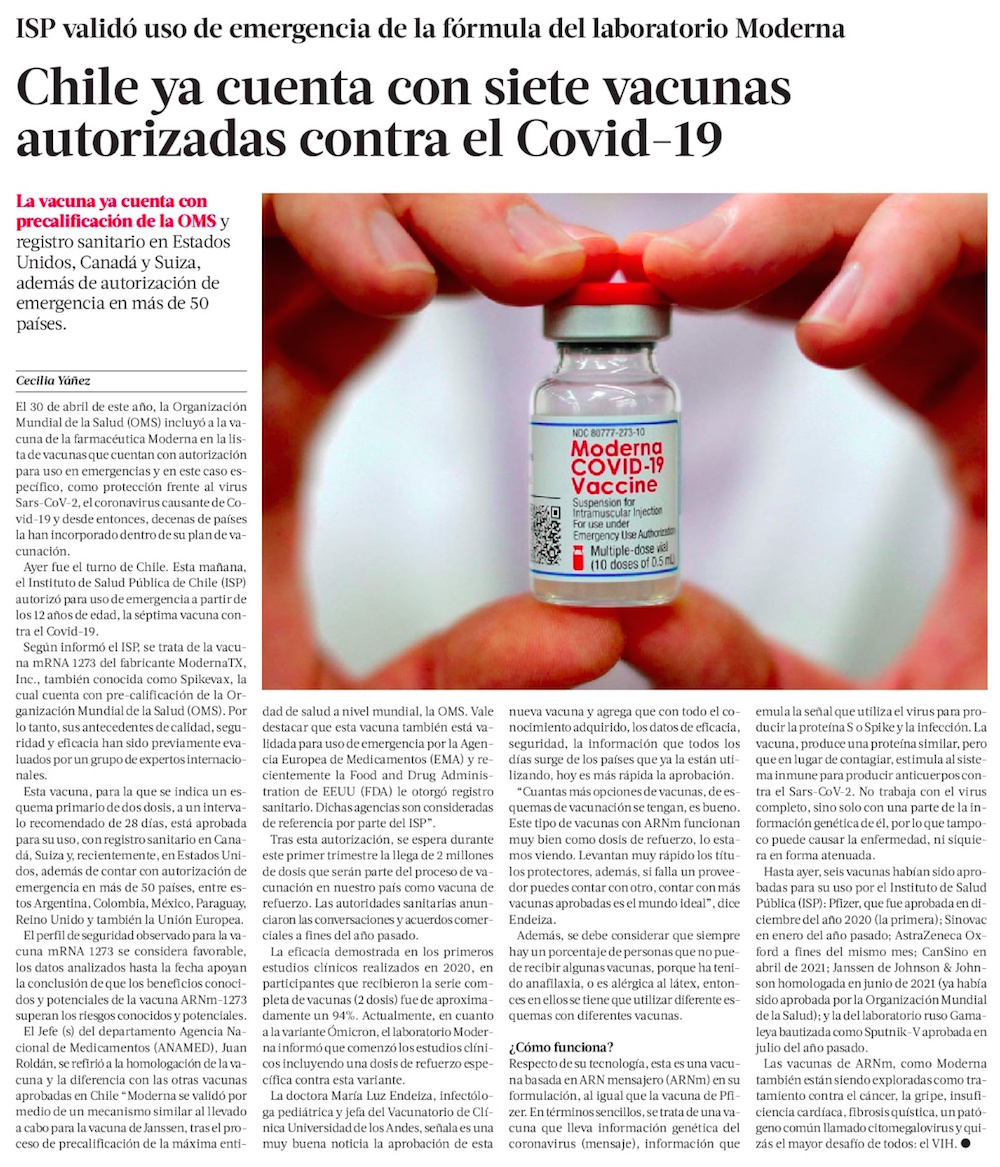 A un año del inicio de la vacunación masiva, Comité Asesor recomienda cuarta dosis “universal” - (El Mercurio de Santiago)