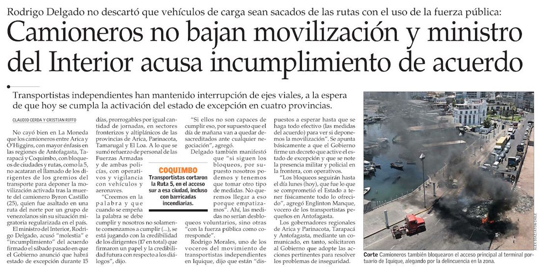 En tensa jornada gobierno emplaza a camioneros a levantar bloqueos de rutas - (La Tercera)