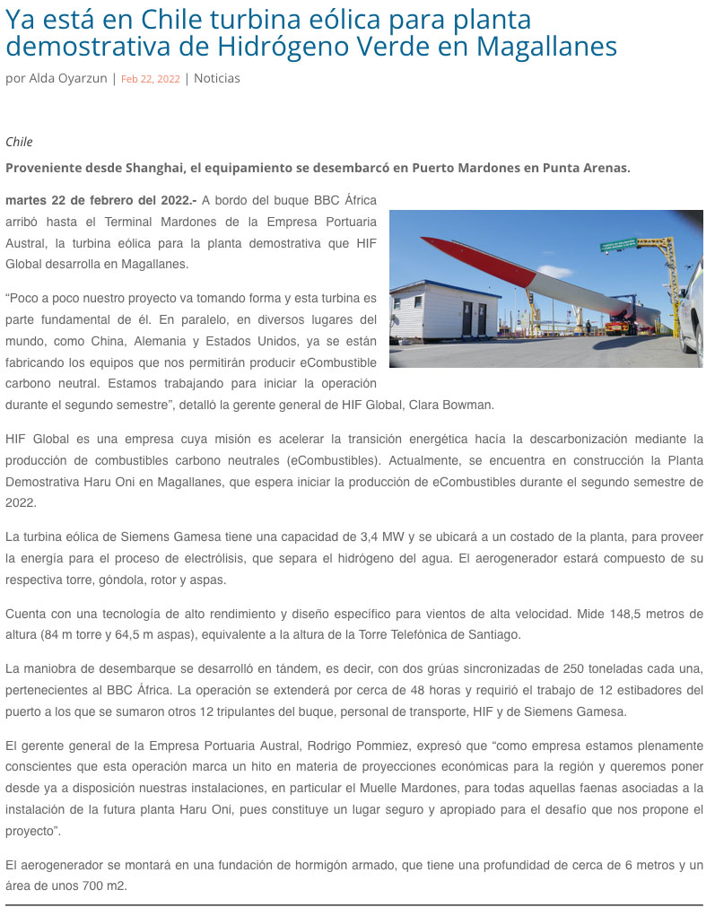 Desembarca turbina eólica para planta demostrativa de HIF - (El Mercurio de Santiago)