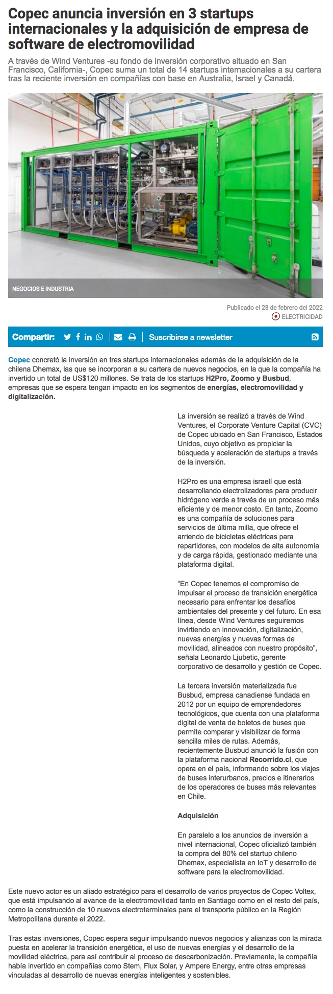 Copec anuncia inversión en 3 startups internacionales y la adquisición de empresa de software de electromovilidad - (Estrategia)