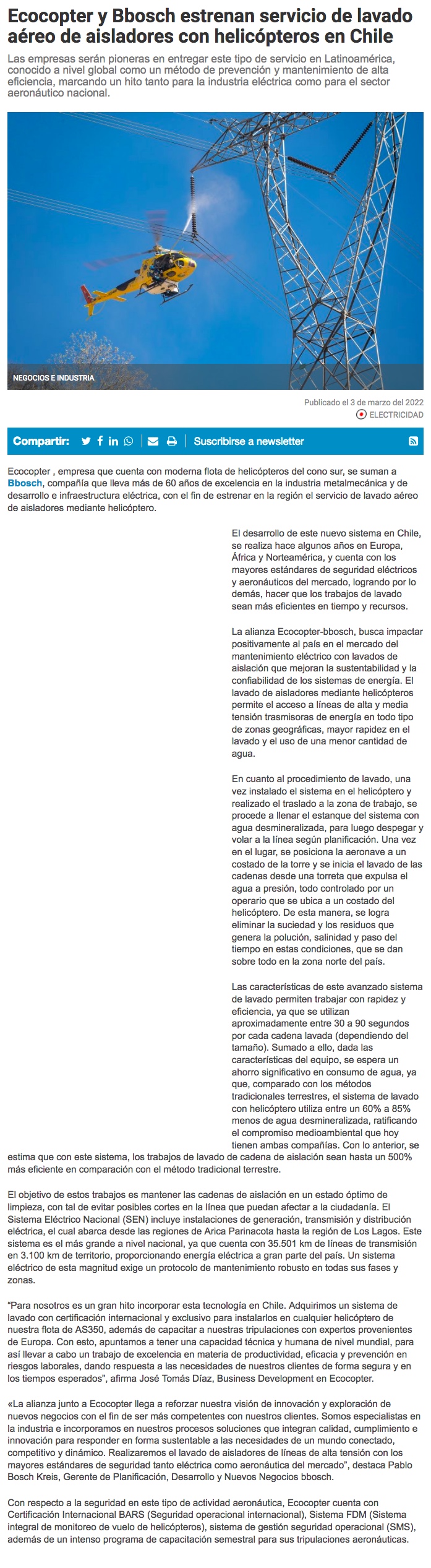 Ecocopter y BBOSCH estrenan servicio de lavado aéreo de aisladores con helicópteros - (portalminero)
