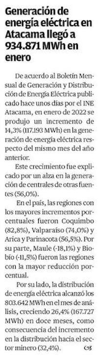 En enero de 2022, la generación de energía eléctrica en Atacama llegó a 934.871 MWh - (tierramarillano.cl)