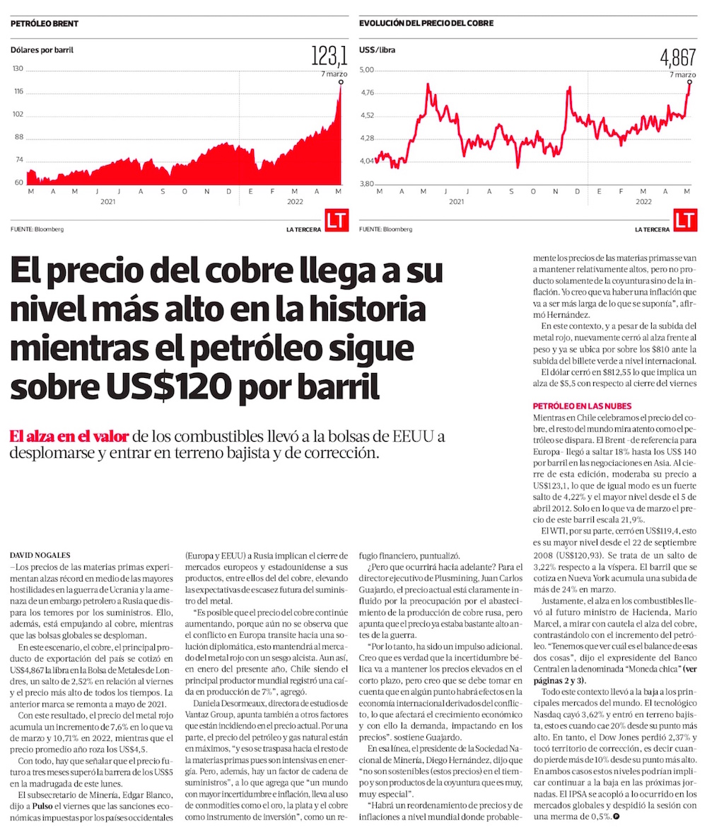 Cobre toca nuevos máximos por conflicto en Ucrania y las bolsas caen ante temor de una larga duración - (Diario Financiero)
