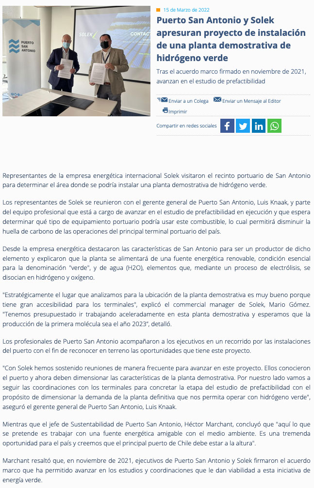 Solek y Puerto San Antonio aceleran proyecto de planta demostrativa de hidrógeno verde - (portalportuario)