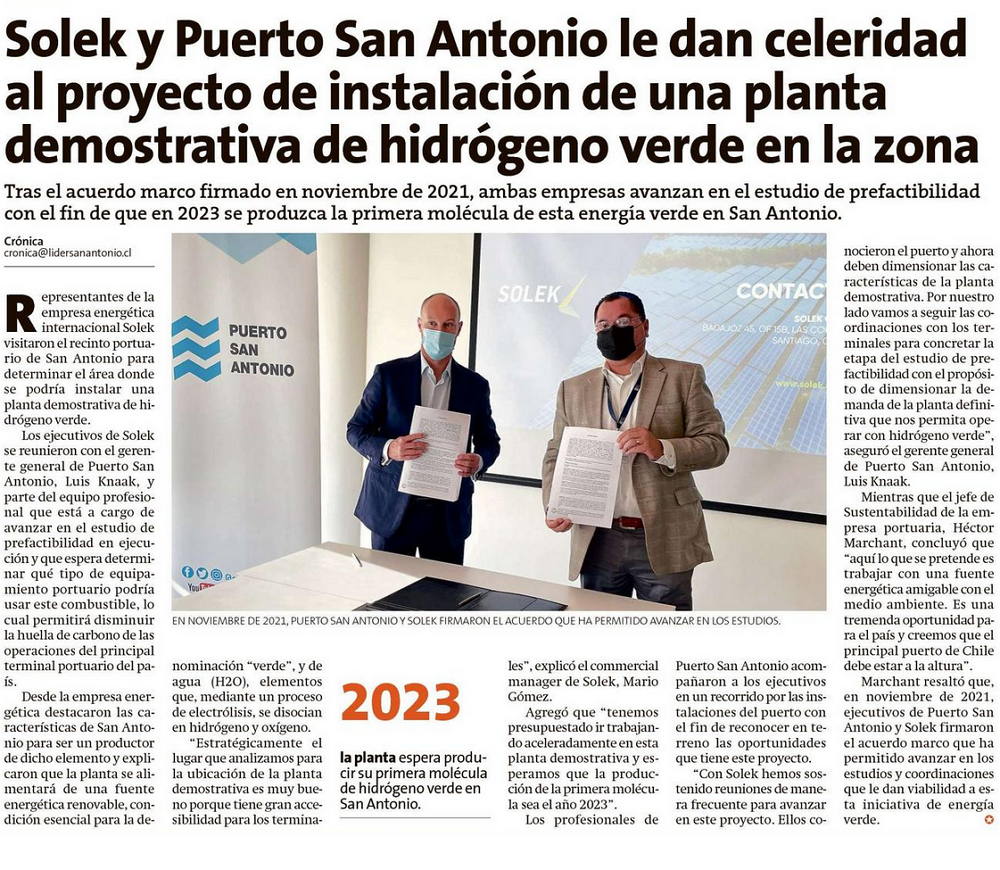 Solek y Puerto San Antonio aceleran proyecto de planta demostrativa de hidrógeno verde - (portalportuario)